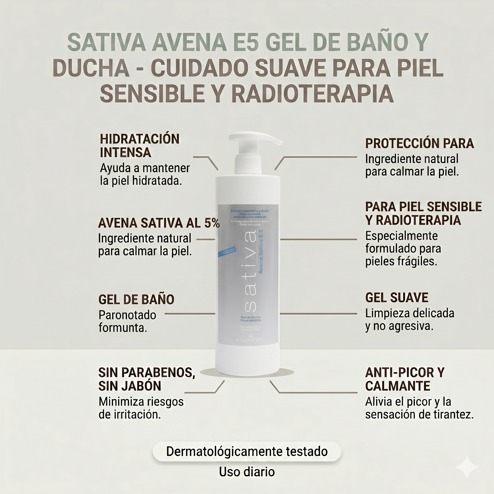 Sativa E5 es un gel de baño dermatológico formulado sin jabón (Syndet = Synthetic Detergent) para la higiene diaria de las pieles más frágiles. A diferencia de los geles convencionales que arrastran los lípidos naturales de la piel, su base lavante extra-suave limpia por afinidad, respetando el manto ácido protector. Enriquecido con Avena Sativa, calma la piel irritada desde la ducha, evitando la sensación de tirantez al salir del agua.
