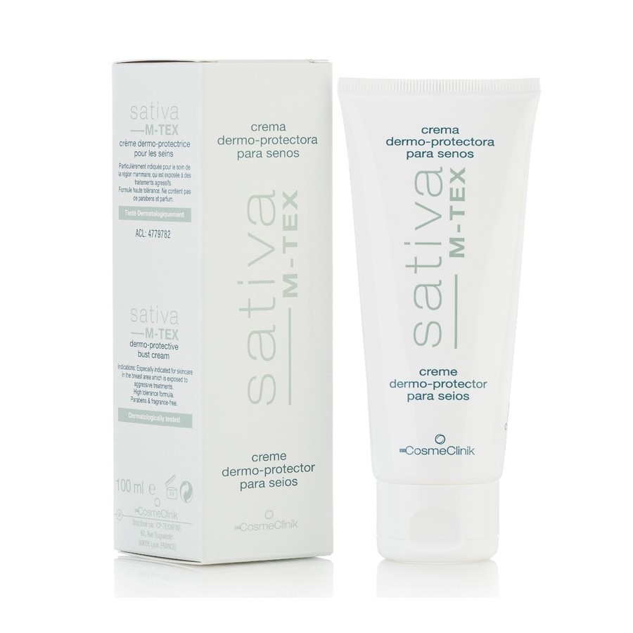 Sativa M-Tex es la emulsión dermo-protectora diseñada para la piel sensible de la zona mamaria, especialmente indicada durante tratamientos oncológicos con radioterapia. Su innovadora fórmula combina Tex-Oe®, Ácido Hialurónico, Aloe Vera, Bisabolol, Karité y Avena Sativa, ofreciendo: