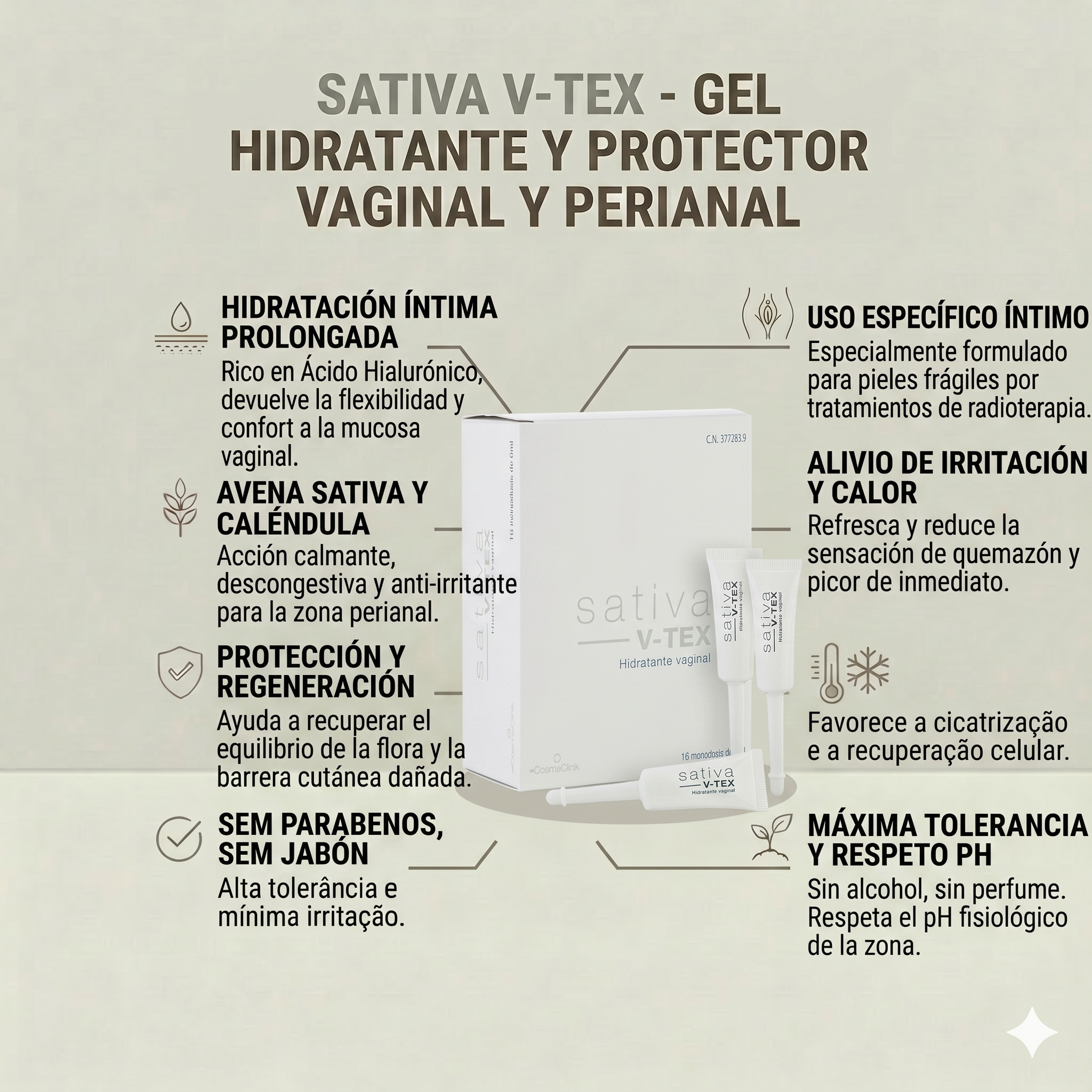Sativa V-Tex es un gel hidratante y protector de la mucosa vaginal formulado específicamente para aliviar la sequedad severa, el picor y la dispareunia (dolor) asociados a tratamientos oncológicos agresivos. Su formato en monodosis con cánula garantiza una aplicación higiénica y precisa tanto interna como externa. Actúa creando una película bio-adhesiva que hidrata, calma y protege la mucosa frente a la irritación.