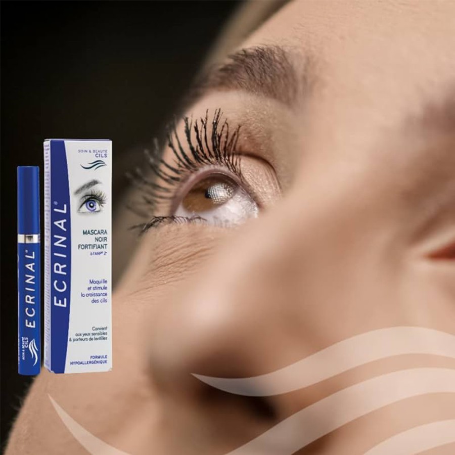 La máscara de pestañas negra fortificante de ECRINAL maquilla y fortalece las pestañas.