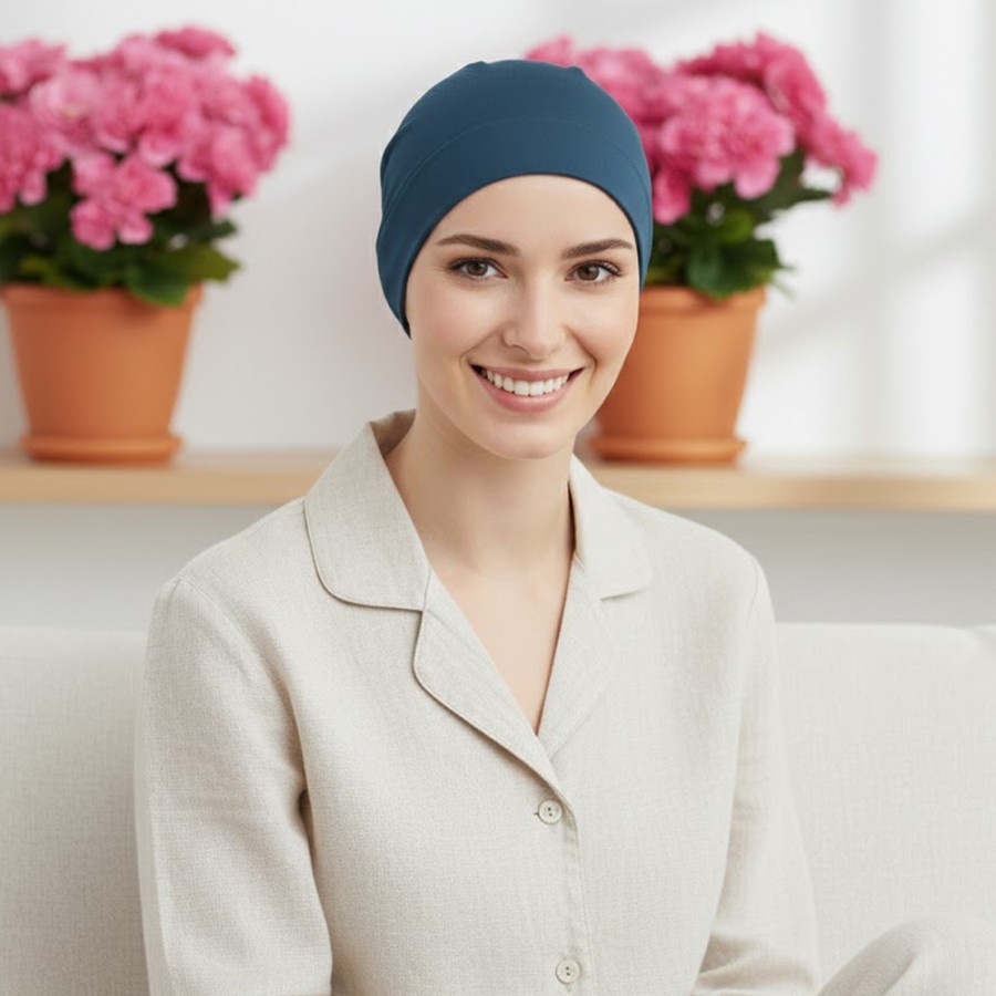 Descansa con total tranquilidad con el Gorro de Dormir Natalia. 🌙 Especialmente diseñado para el descanso de personas en tratamiento oncológico o con alopecia, este gorrito está confeccionado en algodón de alta calidad, extremadamente suave y transpirable. Su función principal es proteger el cuero cabelludo sensible y mantener la temperatura corporal durante la noche, evitando la pérdida de calor. ¡Siente la ligereza de no llevar nada mientras cuidas tu piel! ✨