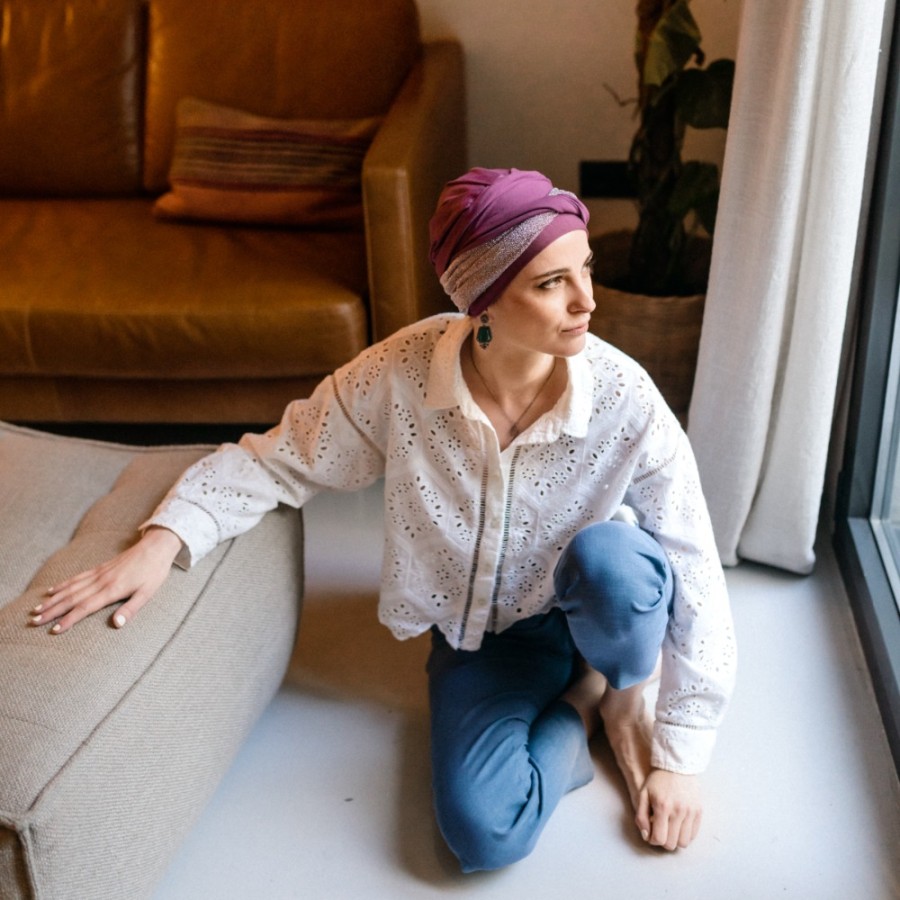 La combinación del malva intenso con la banda en acabado sutilmente brillante aporta un toque sofisticado y femenino que ilumina el rostro. Un turbante oncológico versátil, ideal tanto para el día a día como para ocasiones especiales en primavera/verano.