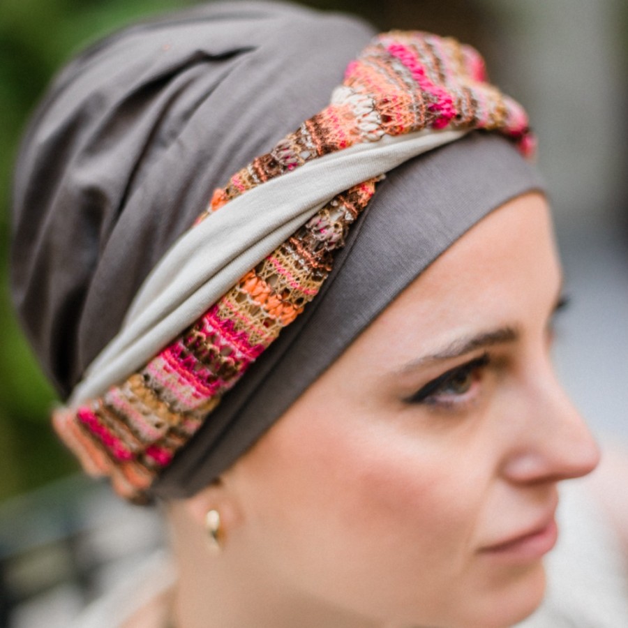 Tiene un diseño preformado facilita una colocación rápida y sencilla. Se compone de un gorro base en tono gris noche que aporta elegancia y versatilidad, junto con una banda semi-integrada que añade volumen y estructura. La pieza central presenta un estampado boho en tonos coral, fucsia y tierra con sutiles matices dorados, iluminando el rostro y aportando personalidad a cualquier look de primavera/verano.