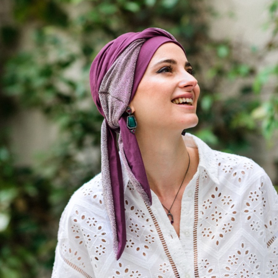 La combinación del malva con la banda en tono rosa empolvado con acabado sutilmente brillante crea un efecto sofisticado que ilumina el rostro. Un turbante oncológico elegante, ideal tanto para el día a día como para ocasiones especiales en primavera/verano.