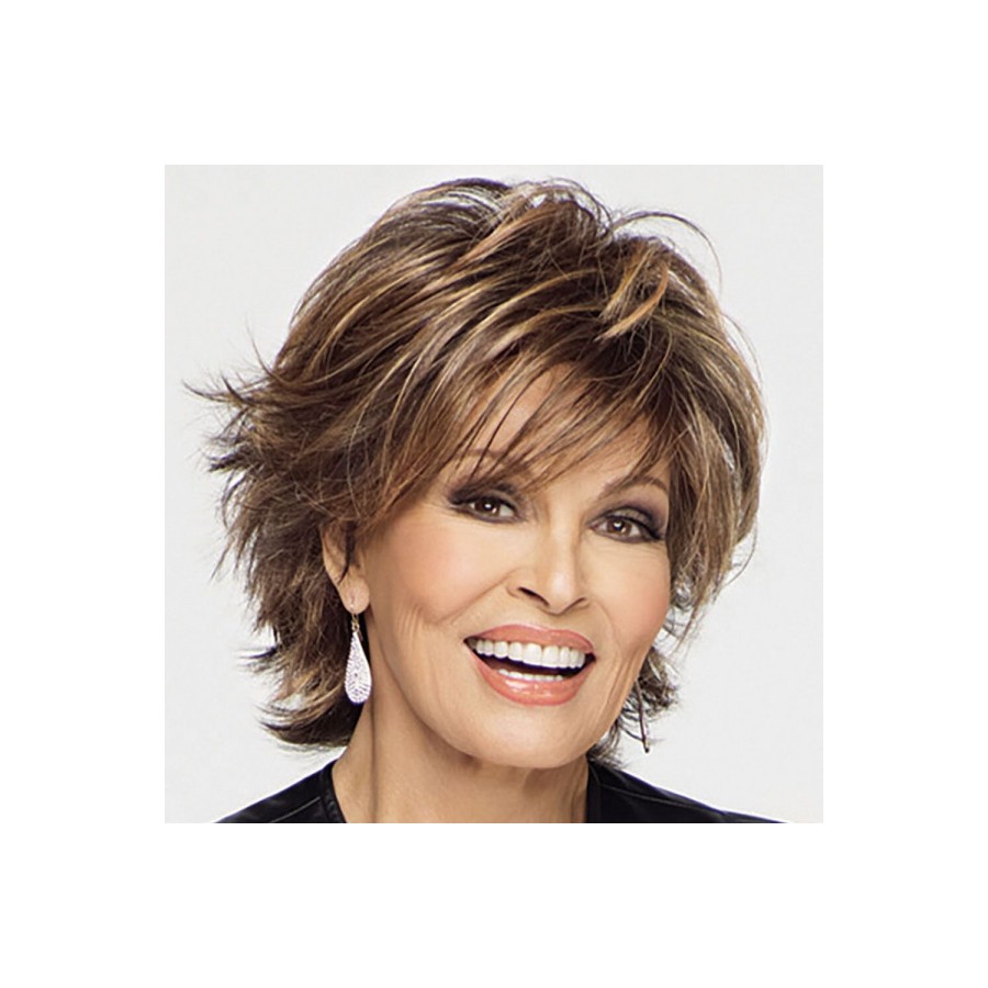 Un look moderno en un corte despuntado y actual. La peluca Indiana Mono que luce Raquel Welch tiene una largura intermedia. Muy funcional y transpirable.